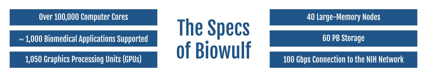 Biowulf is the world’s most powerful supercomputer solely dedicated to advancing biomedical research and is used by 75% of NIH Principal Investigators across NIH represented by more than 2,400 active users. Biowulf also attracts top data science and research talent to the NIH intramural research program.